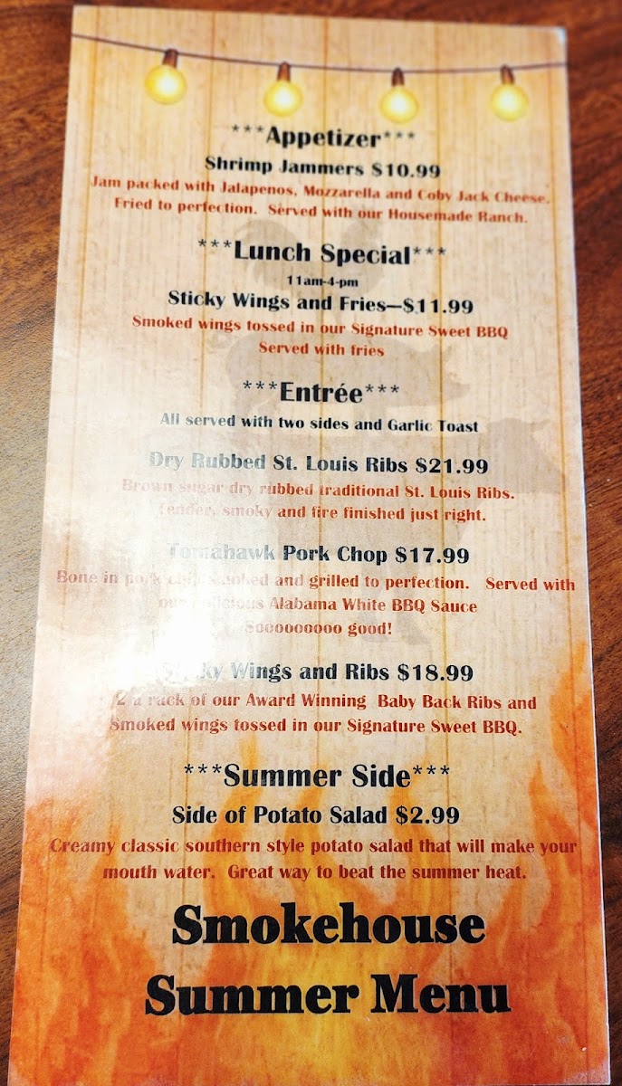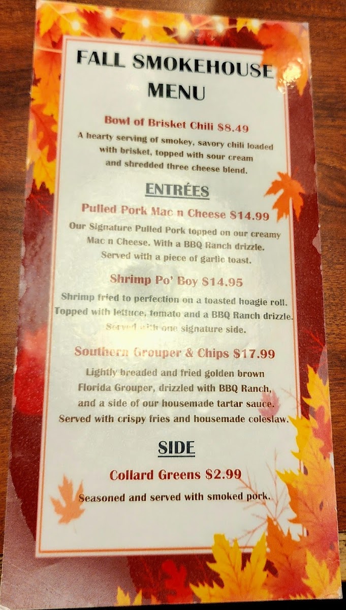Beverages include bottomless soft drinks, freshly brewed coffee, and a modest selection of beer and wine, suited to complement the savory richness of the barbecue without fuss. Overall, the menu supports an easygoing, comfortable dining experience where hearty flavors and familiar comforts set the tone for enjoyable everyday moments.